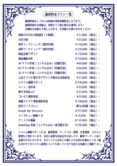 顧問契約をしても個別料金プランは適用されますのでご注意くださいませ。詳細お尋ねください。